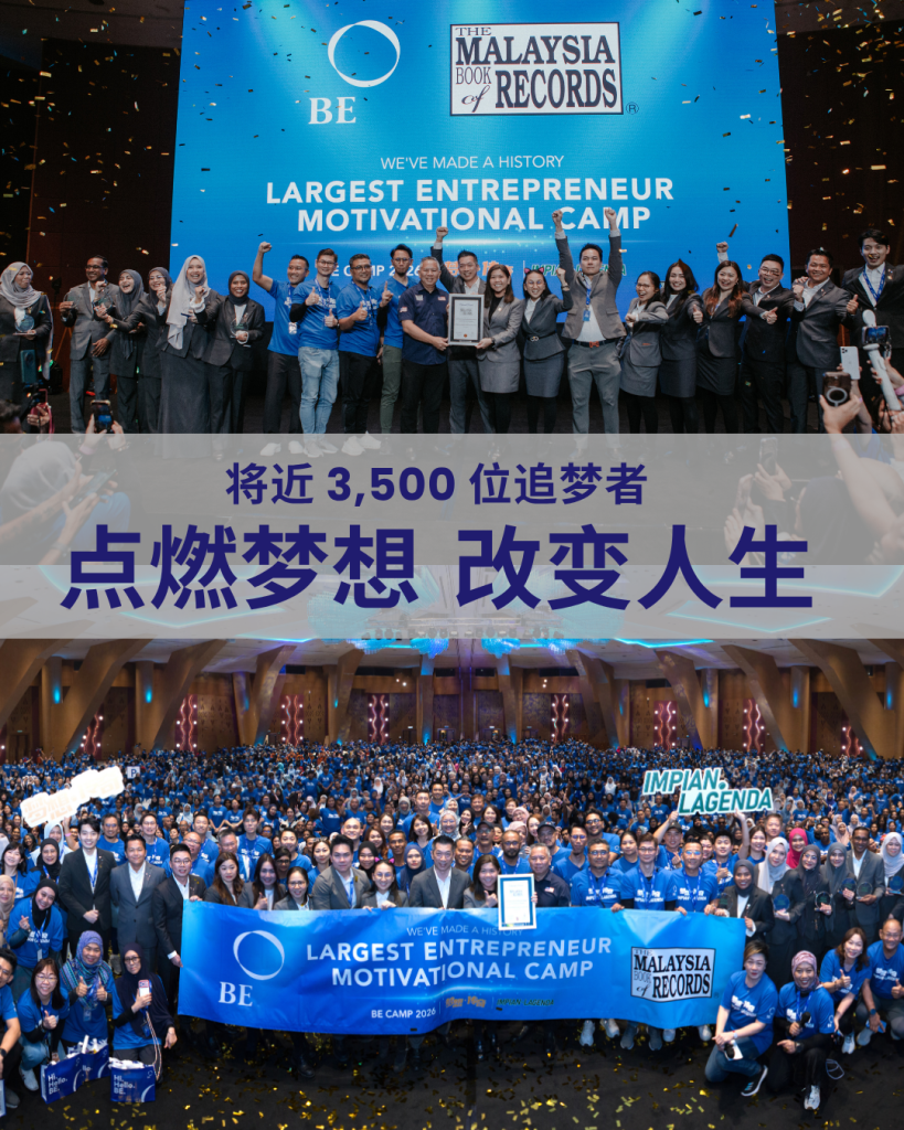就在刚过去的 BE CAMP,将近3,500位为了理想中的生活而努力的追梦者齐聚一堂,参与了这场2天1夜超越极限生活营。每一年的 BE CAMP 都得到数千人的热烈响应,但今年尤为特别,因为我们决定让这个纪录正式载入史册当中,正式打破了《马来西亚纪录大全》的官方纪录,拿下了史上最大型的创业者激励营的称号!我们也是同行业中的首家企业得到次荣誉,再一次印证了 BE 平台的强大之处,以及各界对我们的认同!
