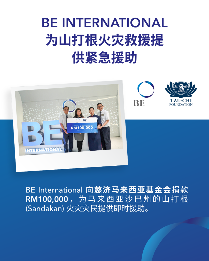 BE International 宣布捐出 RM100,000 以资助慈济基金会的紧急赈灾工作。我们深信,在危机时刻挺身而出、援助有需要的人,是每个人共同的责任,也期望这份援助能为正面临困境的灾民带来一丝温暖与安慰。