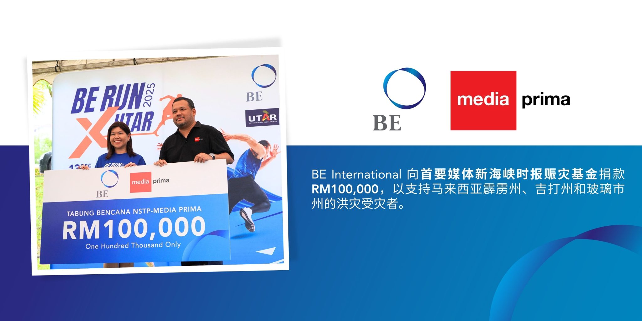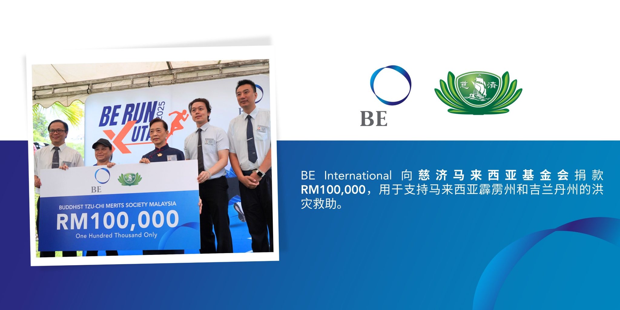 除了慈善义跑之外,BE Foundation 希望为近期受天灾困扰的灾黎出一份力,捐赠 RM200,000 (约新加坡元 63,000)以援助受灾社区,其中 RM100,000(约新加坡元 31,500) 拨给慈济马来西亚基金会,用于支持在马来西亚霹雳州和吉兰丹州的洪灾救助;RM100,000(约新加坡元 31,500) 拨给首要媒体新海峡时报赈灾基金,用于支持马来西亚霹雳州、吉打州和玻璃市州的近期洪灾受灾者。