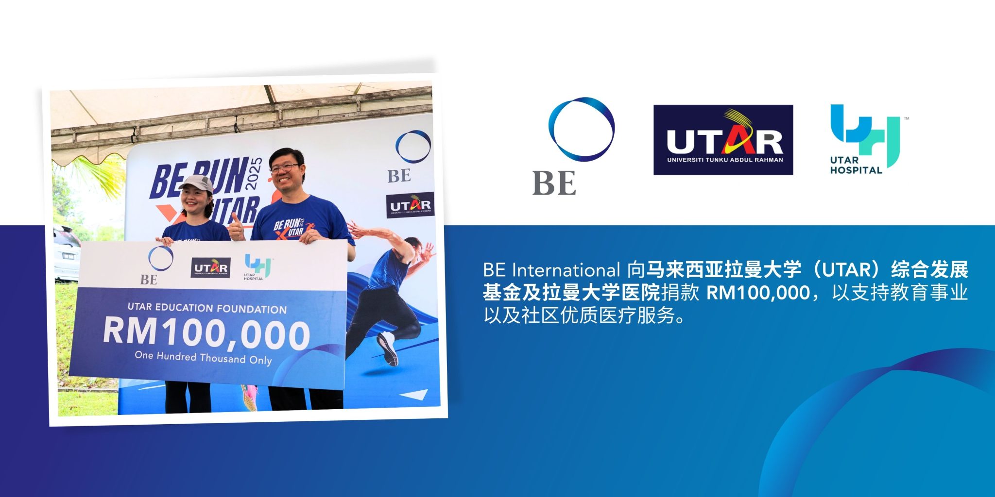 此次义跑活动的所有净收益均拨入马来西亚拉曼大学(UTAR)综合发展基金及拉曼大学医院,用于支持教育事业以及关注社区优质医疗服务。透过此活动,BE International 向拉曼大学(UTAR)发展基金捐赠了 RM100,000(约新加坡元 31,500),进一步彰显我们对社区福祉的承诺。